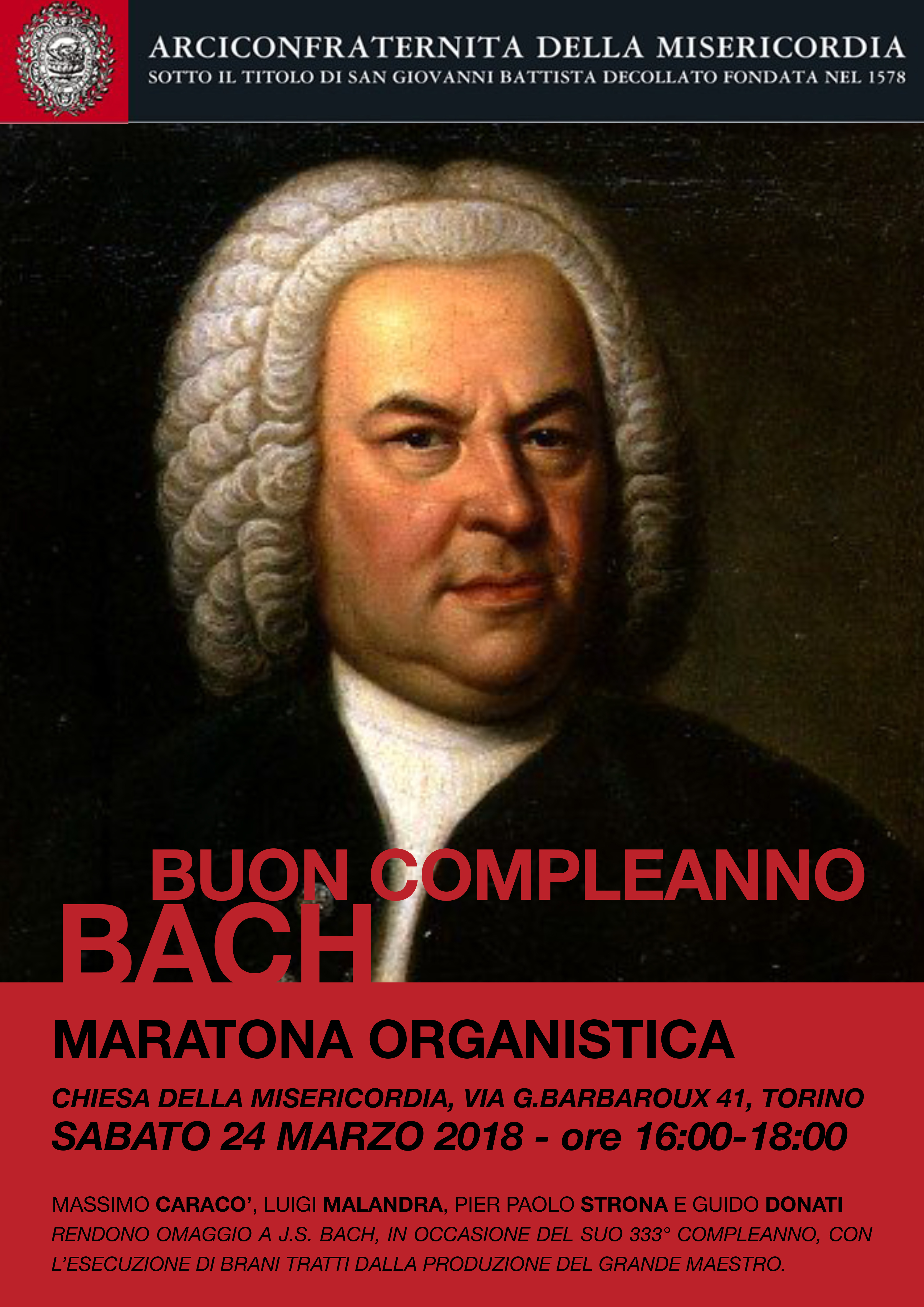 Maratona organistica “Buon Compleanno Bach”. Ore 16.00-18.00, Chiesa della Misericordia, via G. Barbaroux 41, Torino.